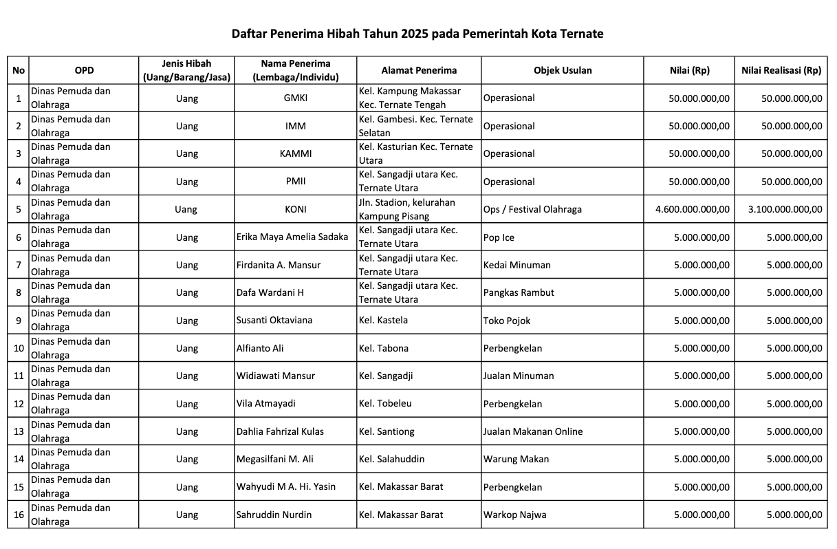 Daftar Pengusul Hibah Pemerintah Kota Ternate Tahun 2025